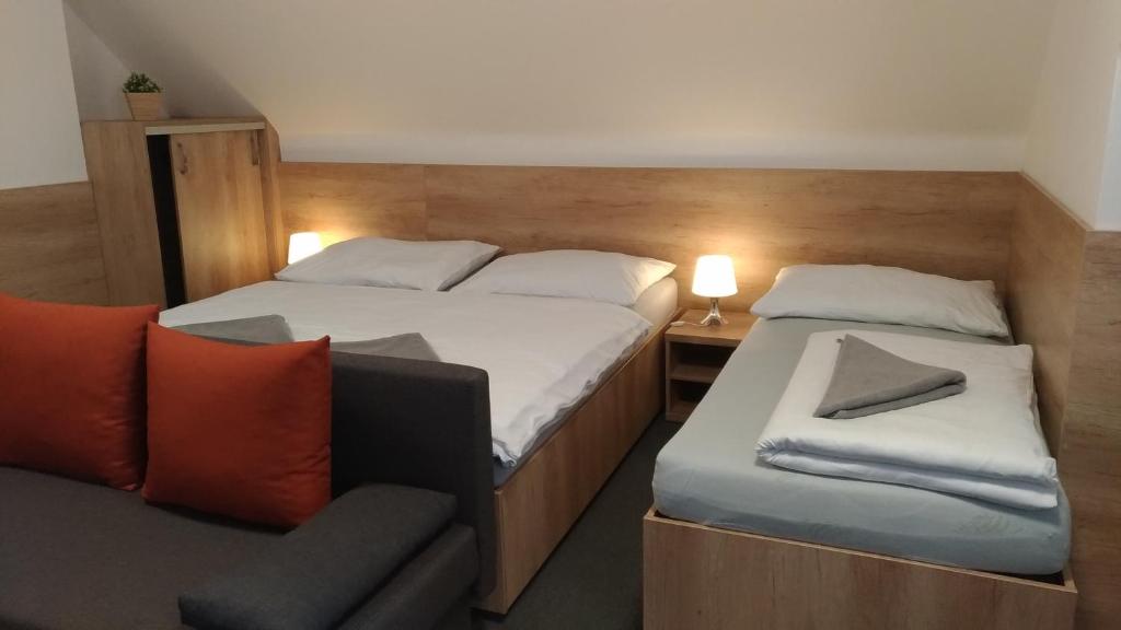Dvě jednolůžkové postele, dvě rozkládací pohovky a velká manželská postel s koupelnou.